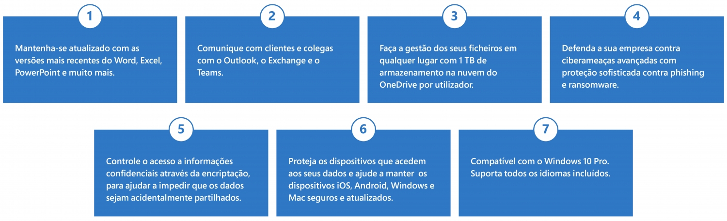Inclui tudo o que a versão Business Standard oferece, mas adiciona-lhe muitas funcionalidades de segurança avançada e de gestão de dispositivos, para o ajudar a proteger os dados da sua empresa em todos os dispositivos utilizados, sejam estes pessoais ou da organização.